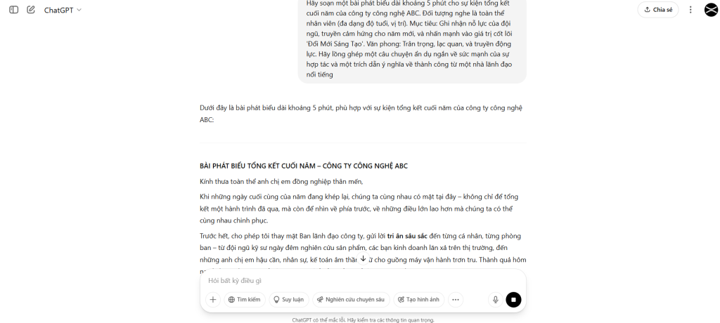 - Sử dụng ChatGPT cho bài phát biểu trong các sự kiện cá nhân (cưới hỏi, kỷ niệm) có phù hợp? Rất phù hợp. Dù là lời phát biểu của cô dâu chú rể, cha mẹ hay bạn bè, ChatGPT có thể giúp bạn phác thảo những ý tưởng chân thành, hài hước hoặc trang trọng, tùy theo yêu cầu của bạn, giúp bạn tự tin hơn trong khoảnh khắc trọng đại.