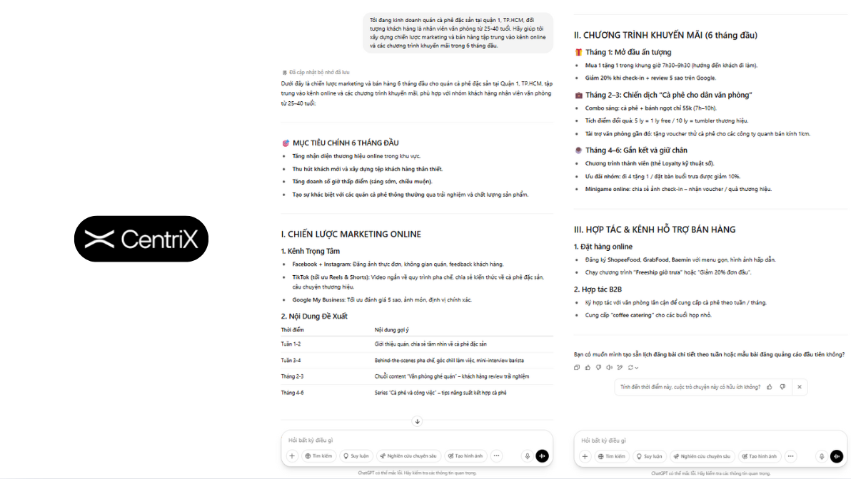 - Ví dụ: Thay vì hỏi “Viết cho tôi kế hoạch marketing”, hãy hỏi: “Tôi đang kinh doanh quán cà phê đặc sản tại quận 1, TP.HCM, đối tượng khách hàng là nhân viên văn phòng từ 25-40 tuổi. Hãy giúp tôi xây dựng chiến lược marketing và bán hàng tập trung vào kênh online và các chương trình khuyến mãi trong 6 tháng đầu.”