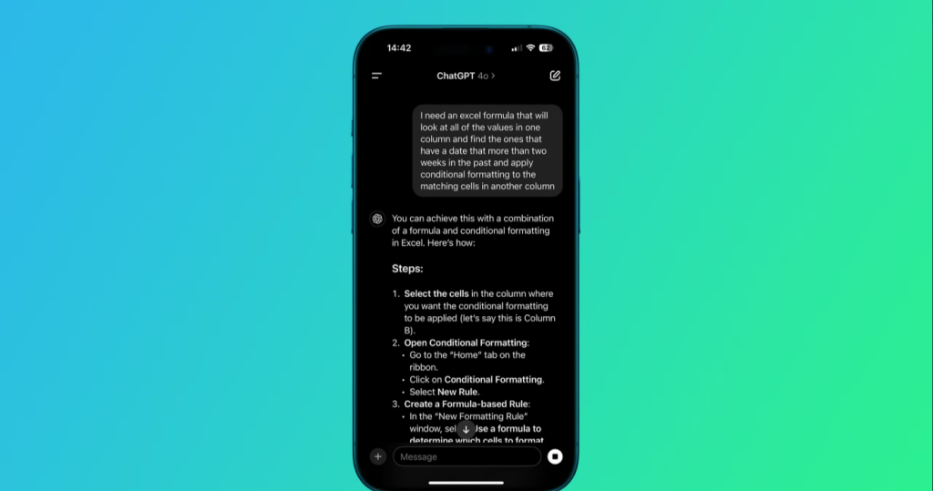 Ví dụ: Bạn có thể gõ “Tạo công thức Excel để tính chiết khấu khi giá > 2 triệu và số lượng > 10” – ChatGPT sẽ trả ngay đoạn công thức chính xác và giải thích từng bước.