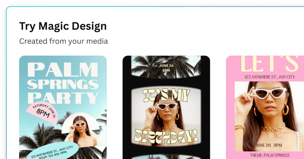 Magic Design là công cụ giúp bạn tạo ra một bộ thiết kế hoàn chỉnh chỉ từ một mô tả hoặc một hình ảnh đầu vào. Đây là lựa chọn lý tưởng nếu bạn không muốn bắt đầu từ template có sẵn.