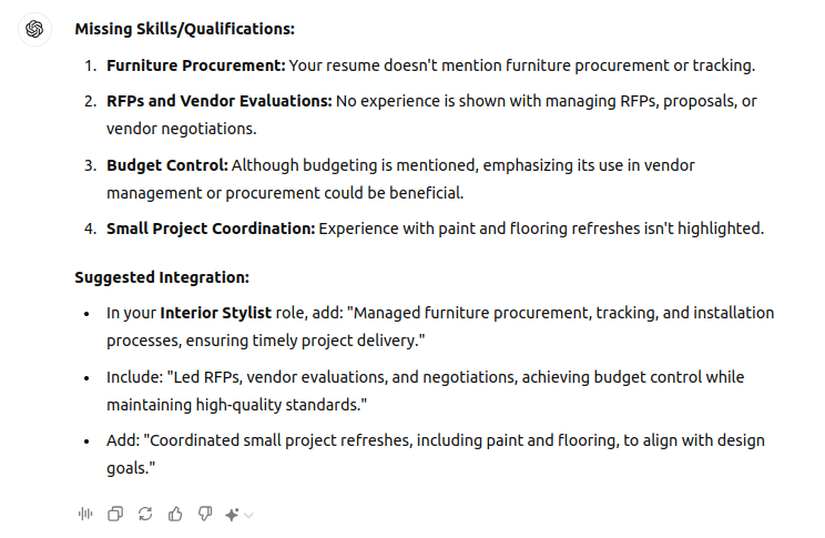 ChatGPT có thể so sánh CV của bạn với mô tả công việc (Job Description) và nhận diện các từ khóa còn thiếu, giúp bạn bổ sung chúng một cách tự nhiên và hiệu quả.