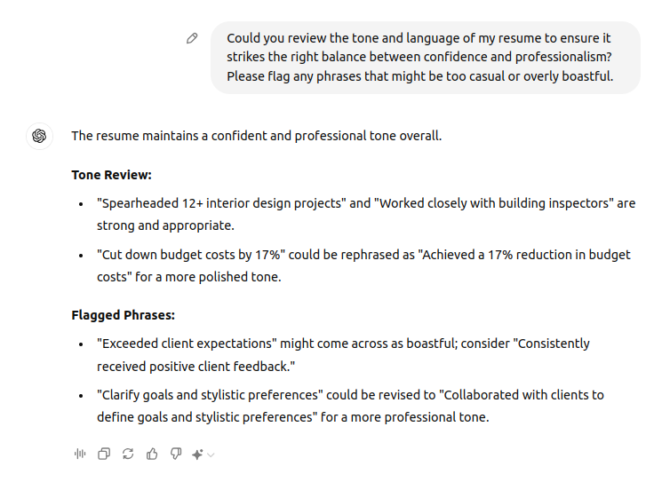 Bạn có thể yêu cầu ChatGPT điều chỉnh tone của CV trở nên chuyên nghiệp, tự tin nhưng không phô trương, đặc biệt phù hợp với từng ngành nghề như tài chính, thiết kế, công nghệ, marketing,…