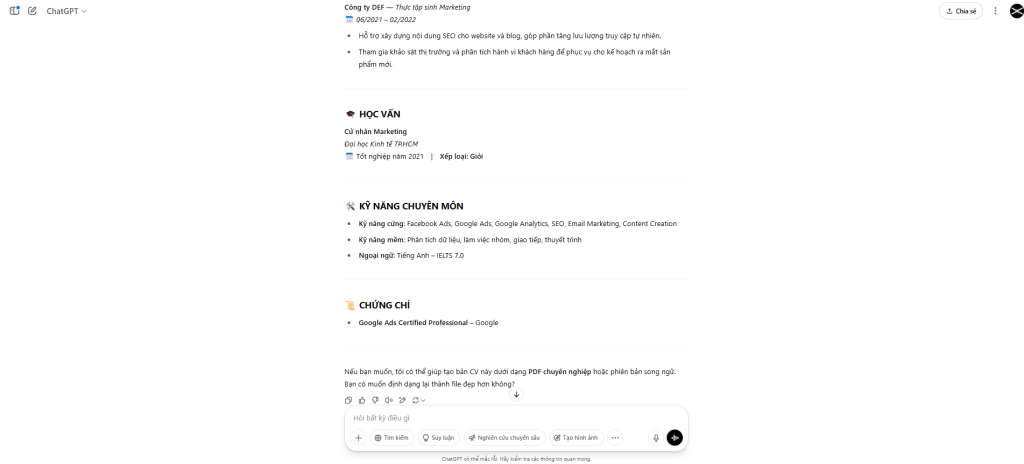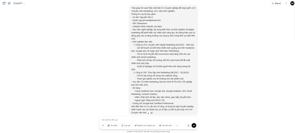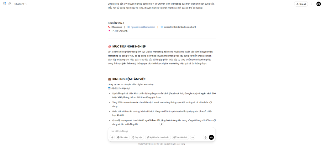 - Prompt ví dụ: “Tôi muốn cập nhật CV hiện tại của mình. Hãy giúp tôi thêm kinh nghiệm làm việc mới: Trưởng nhóm Digital Marketing tại công ty Centrix Software từ tháng 3/2024 đến nay. Công việc chính bao gồm: quản lý ngân sách quảng cáo 1 tỷ VNĐ/tháng, điều phối team 5 thành viên, xây dựng và triển khai chiến lược digital đa kênh (SEM, SEO, Social Media), báo cáo hiệu quả hàng tuần cho ban giám đốc. Các thành tựu chính: tăng trưởng lead 40% sau 6 tháng, tối ưu chi phí quảng cáo giảm 15%.” (Lưu ý: Bạn có thể cần cung cấp phần CV hiện tại của mình cho ChatGPT để nó có ngữ cảnh.)