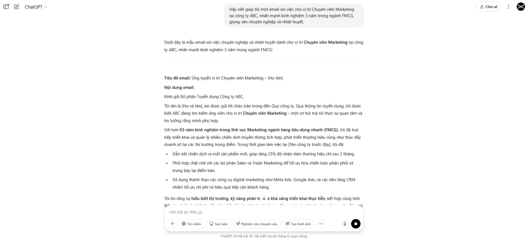 - Cung cấp “Đề Bài” Chi Tiết và Rõ Ràng: Mô tả càng cụ thể, ChatGPT càng hiểu rõ yêu cầu. Ví dụ: “Hãy viết giúp tôi một email xin việc cho vị trí Chuyên viên Marketing tại công ty ABC, nhấn mạnh kinh nghiệm 3 năm trong ngành FMCG, giọng văn chuyên nghiệp và nhiệt huyết.”